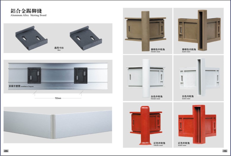 铝合金踢脚线有配备专门的阴阳转角配件及固定件。