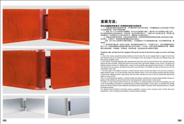 铝合金踢脚线为全铝L型材产品,该型材厚度从0.6mm—1.2mm不等、高度有6cm、8cm、10cm,每条长度均为3米,背面的两条固定卡扣槽及防水胶条槽更保证了产品的平整度。市场较普遍流行的颜色有亮光拉丝、香槟拉丝、钛金拉丝、咖啡拉丝、黑钛拉丝、枪色拉丝、紫金拉丝及各种喷涂氧化等。